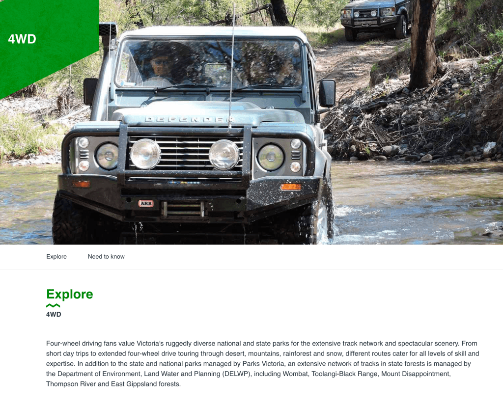 Do these other outdoor activities get the same level of scrutiny on Parks Victoria’s generic website? Let’s compare what else is listed on the Things to Do page. Let’s start with one that has a pretty bad reputation for high impacts – 4WDing.