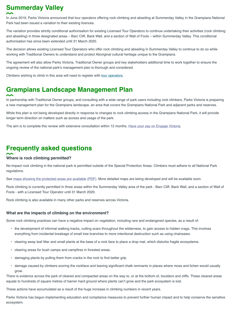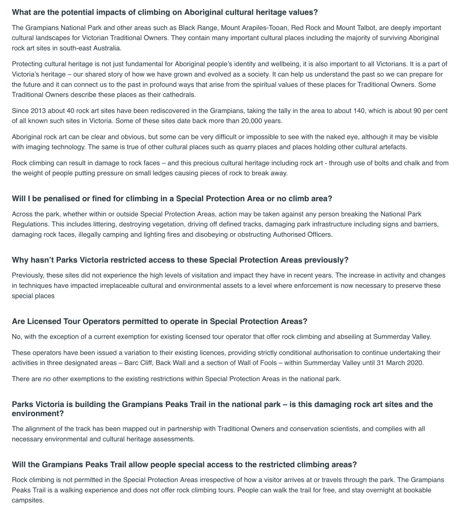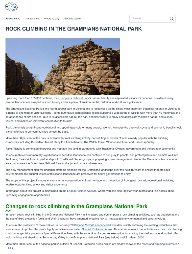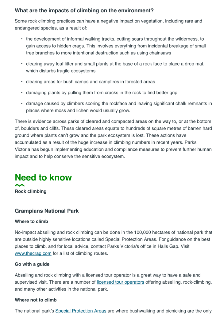 The damage that information like this does to the climbing tourism industry is hard to quantify. But in a time when regional areas are struggling to stay afloat it amazes us that this is the angle that Parks Victoria is taking. We wonder what the regional tourism body that runs the Visit Grampians website thinks of PV’s approach?