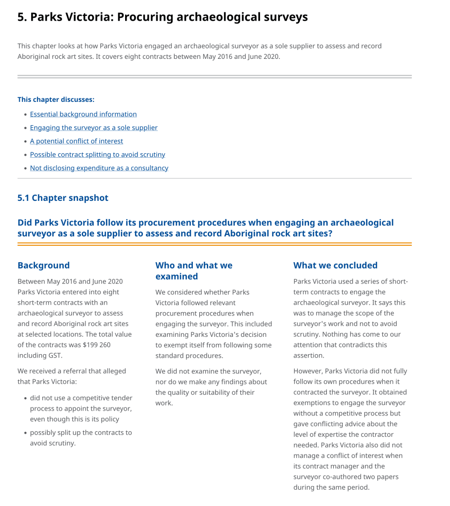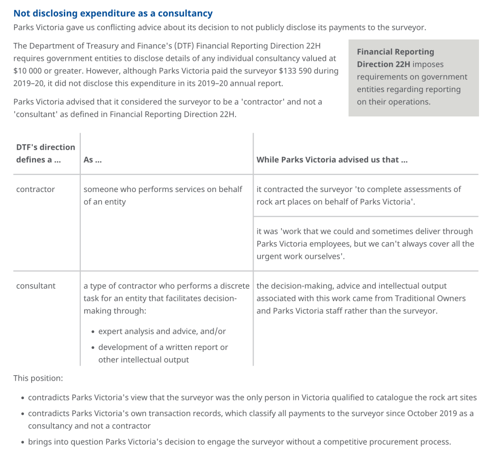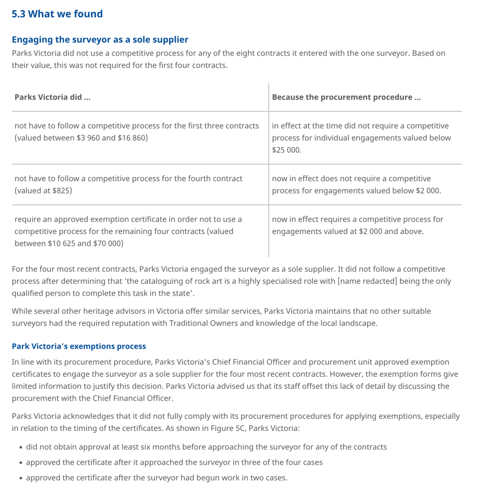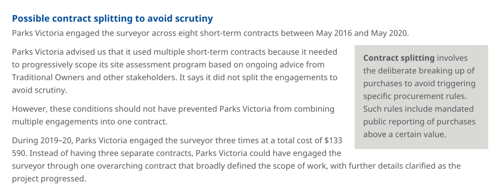 Parks Victoria used a series of short-term contracts to engage the archaeological surveyor. It says this was to manage the scope of the surveyor’s work and not to avoid scrutiny. Nothing has come to our attention that contradicts this assertion.