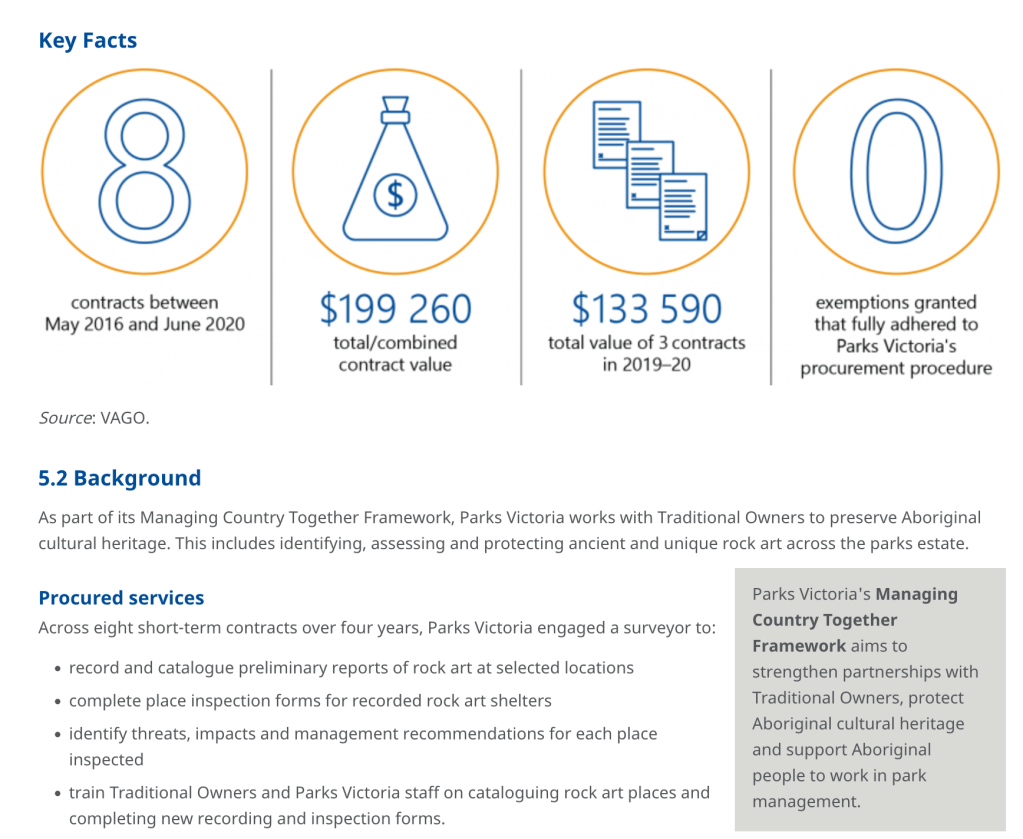 Between May 2016 and June 2020 Parks Victoria entered into eight short-term contracts with an archaeological surveyor to assess and record Aboriginal rock art sites at selected locations. The total value of the contracts was $199 260 including GST.