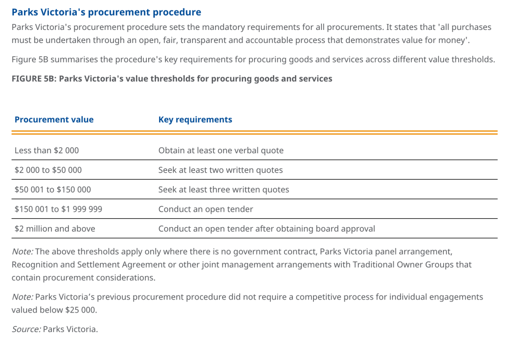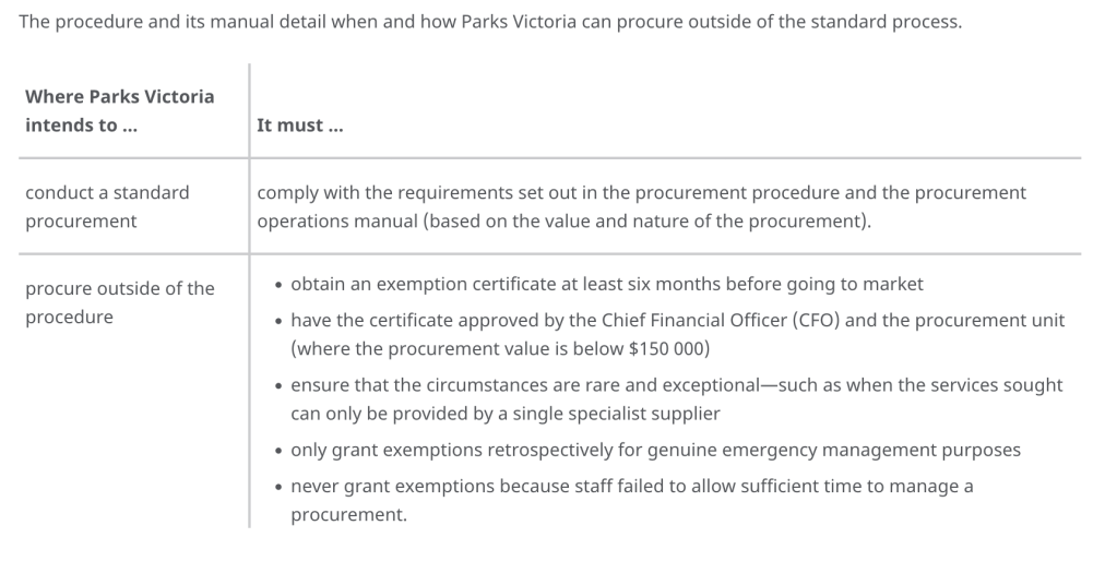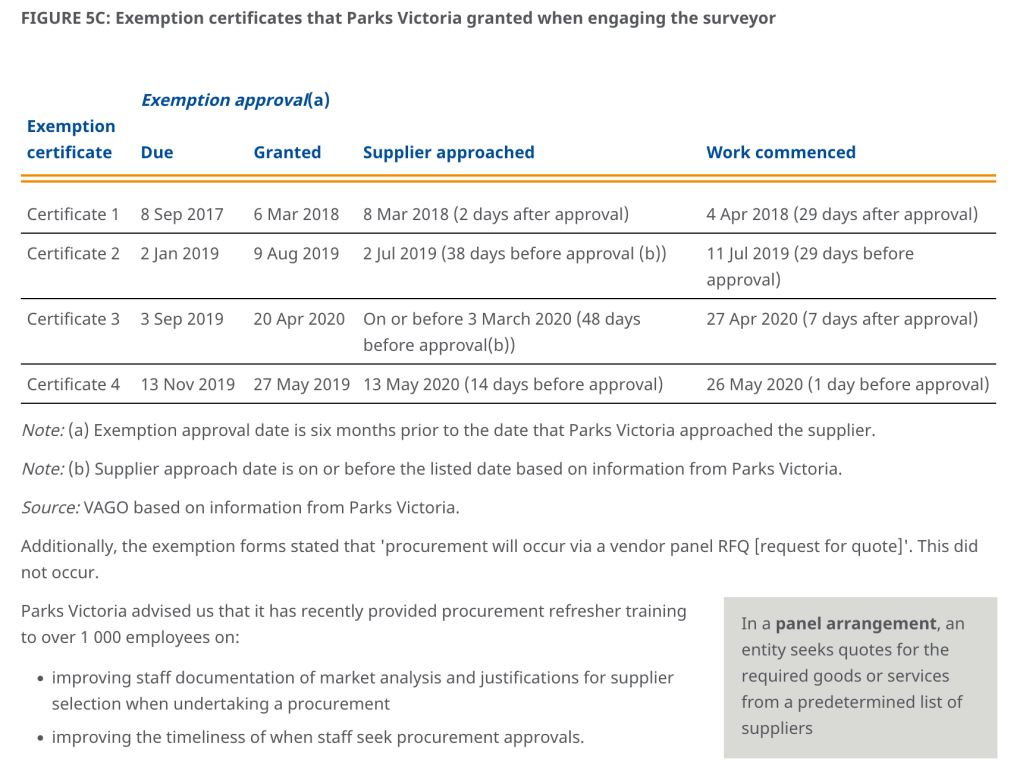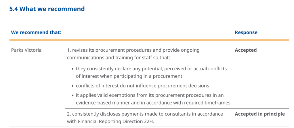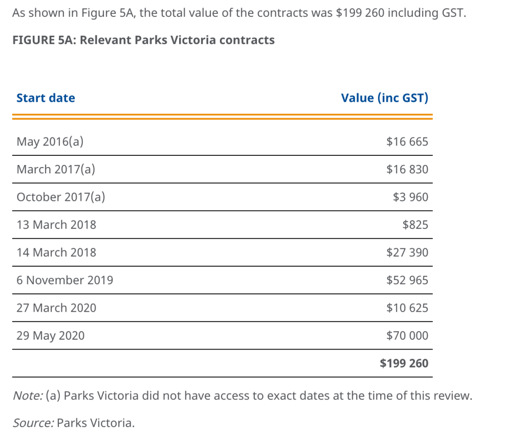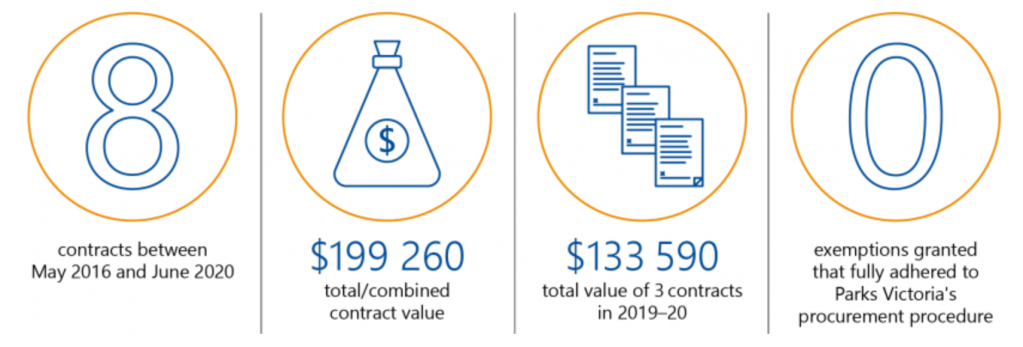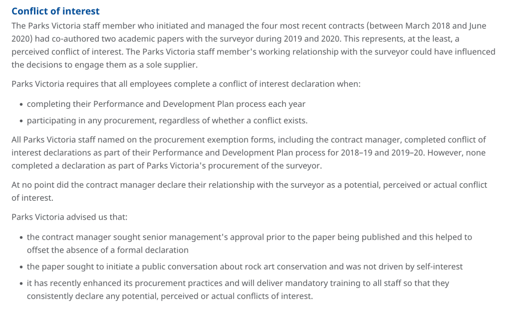 “The Parks Victoria staff member who initiated and managed the four most recent contracts (between March 2018 and June 2020) had co-authored two academic papers with the surveyor during 2019 and 2020. This represents, at the least, a perceived conflict of interest. The Parks Victoria staff member’s working relationship with the surveyor could have influenced the decisions to engage them as a sole supplier.”