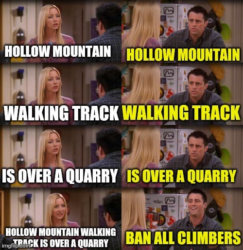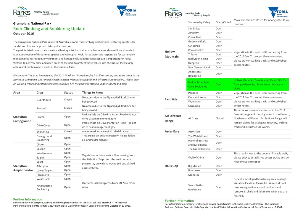 In a 2016 Rock Climbing and Bouldering Update document published by Parks Victoria after a series of major bushfires – they list Hollow Mountain climbing areas as “OPEN” but also says it is a “significant site for Aboriginal people“.