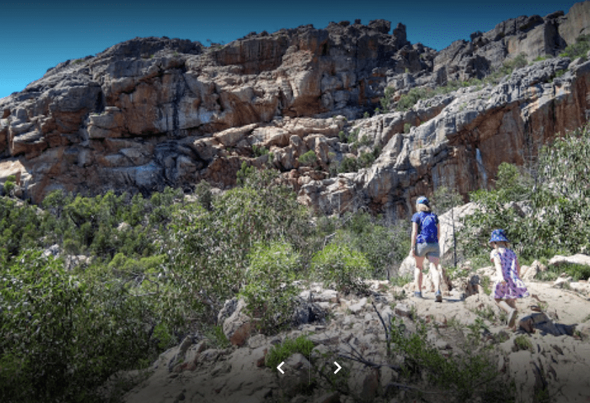 “The track leads you to the base of an iron-stained cliff. It’s a steep and strenuous climb through fallen boulders and along exposed ledges. A short uphill scramble completes the climb to the wind-scoured caverns of Wudjub-guyan (Hollow Mountain) with views overlooking Mount Stapylton and the Wimmera plains. “