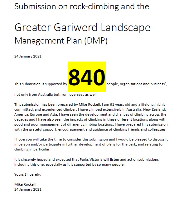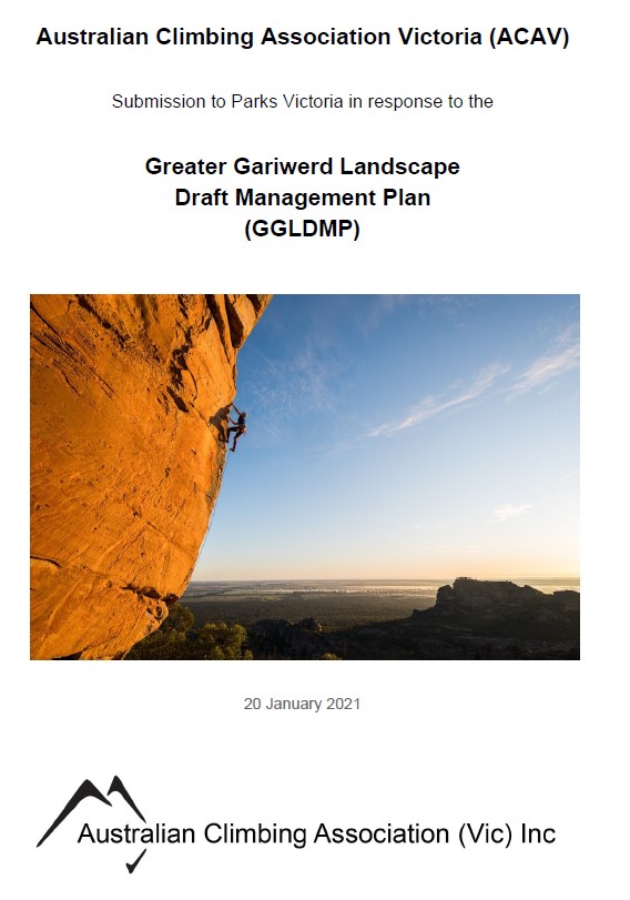 Former ACAV committee member Mike Rockell, has put together a 38 page submission detailing all aspects of the draft GGLMP, where it is lacking, and suggests improvements and ways the climbing community could proactively contribute to the protection of Cultural and environmental values. Over 840 climbers have signed on to support this submission.