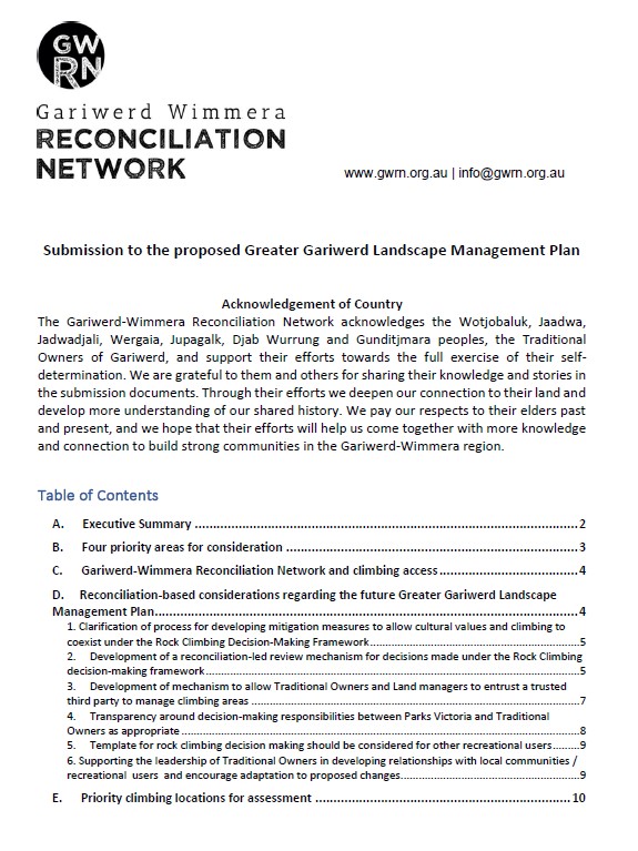 The Grampians Wimmera Reconciliation Network (GWRN) sumbission is “fully supportive of the need to enjoy Gariwerd in ways that are respectful, promote healing and cultural renewal, and enhance the serenity of Country” But also highlights how the plan can avoid contributing to division, and suggests ways in which cooperative management can achieved.