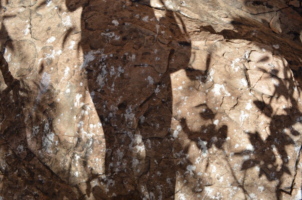 Photo DSC-0430 and Photo DSC_0436 both look up at the same overhanging cliff and, in addition to the prominent bird-guano streak, show more diffuse white and yellow/brown and black streaky colourations – and I assume that it is the origin of these ‘white’ streaks that you are most interested in. These streaks are not formed from bird guano, but are simply the base colour of the rock showing through gaps in the yellow/brown desert varnish that covers the rest of the cliff. The vertical alignment of all of the desert varnish stains, and the white streaks of base colour that disrupt them, clearly indicates that water run-off down the cliff face is the primary control on their formation.