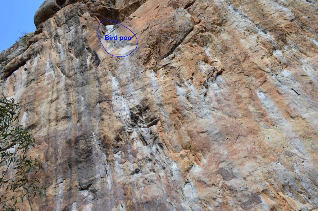 Photo DSC_0424 with the bird excrement dotted across a grey rock, I presume is positioned at the base of the cliff you have mentioned. The grey colour of this rock indicates that this rock is exposed to seasonal rainfall washing – the typical grey colouration can also be seen in the upper, less-steep parts of the background cliffs in photo DSC-0436, and for the same reason.