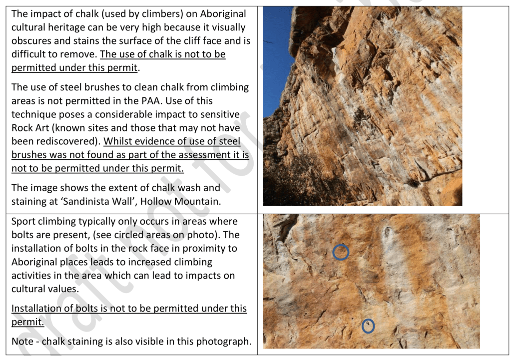 In May 2020 Parks Victoria published a series of photos of Sandinista Wall captioned “This image shows the extent of chalk wash and staining at Sandinista Wall, Hollow Mountain” and “Chalk staining is visible in this photograph“.
